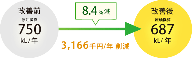 A社様では、省エネ対策としてポンプ・ファンへのインバータ導入、デマンド監視装置の導入等を実施されております。今回、高効率空調機の導入等を目的に受診されました。診断の結果、高効率型空調機への更新、高効率照明への更新、夜間・休日でのコンプレッサ運転台数削減、コンプレッサのドレン抜き方法の改善等をご提案しました。